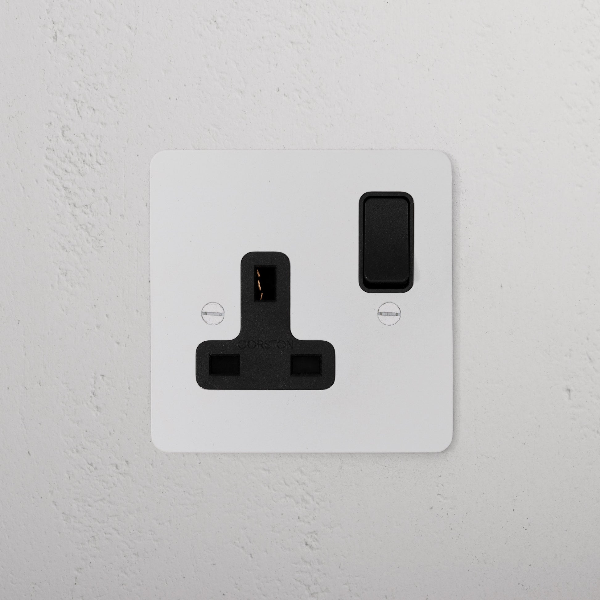 The switch itself and the surrounding frame of the socket are constructed from low-gloss plastic, available in either black or white with a subtly textured surface.