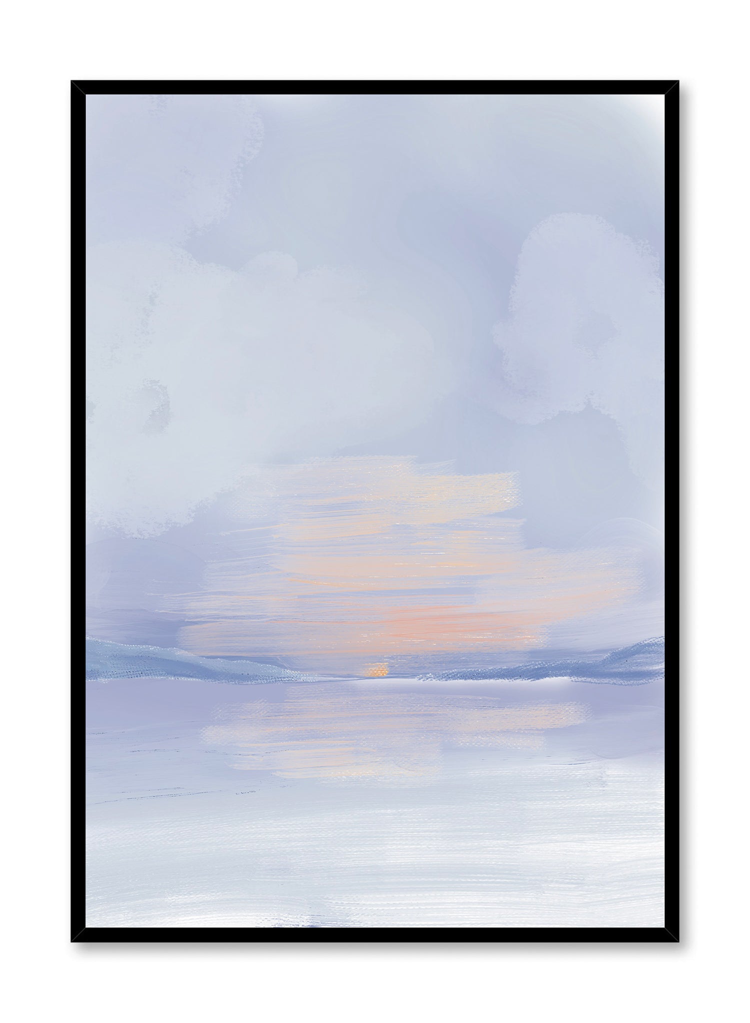 Introduce a serene ambiance to your home with Sleeping Lake: an abstract watercolor depiction of a sunset on the horizon. We are captivated by its soft blue hue and the subtle touch of coral present in this print.