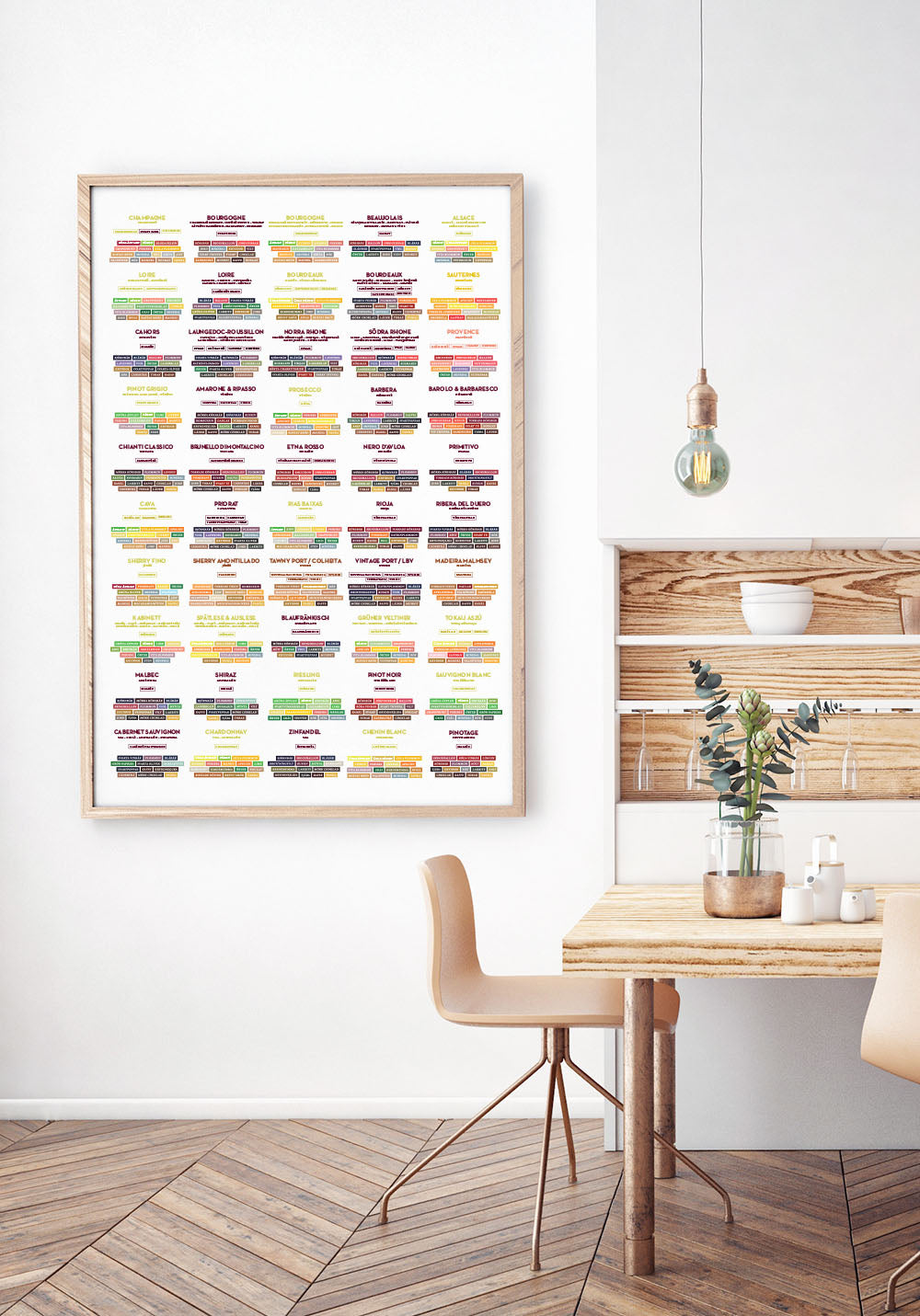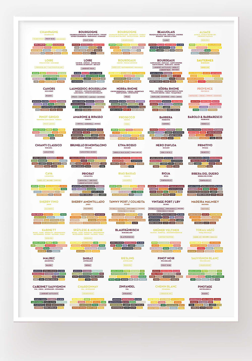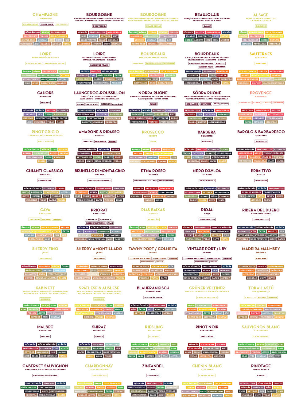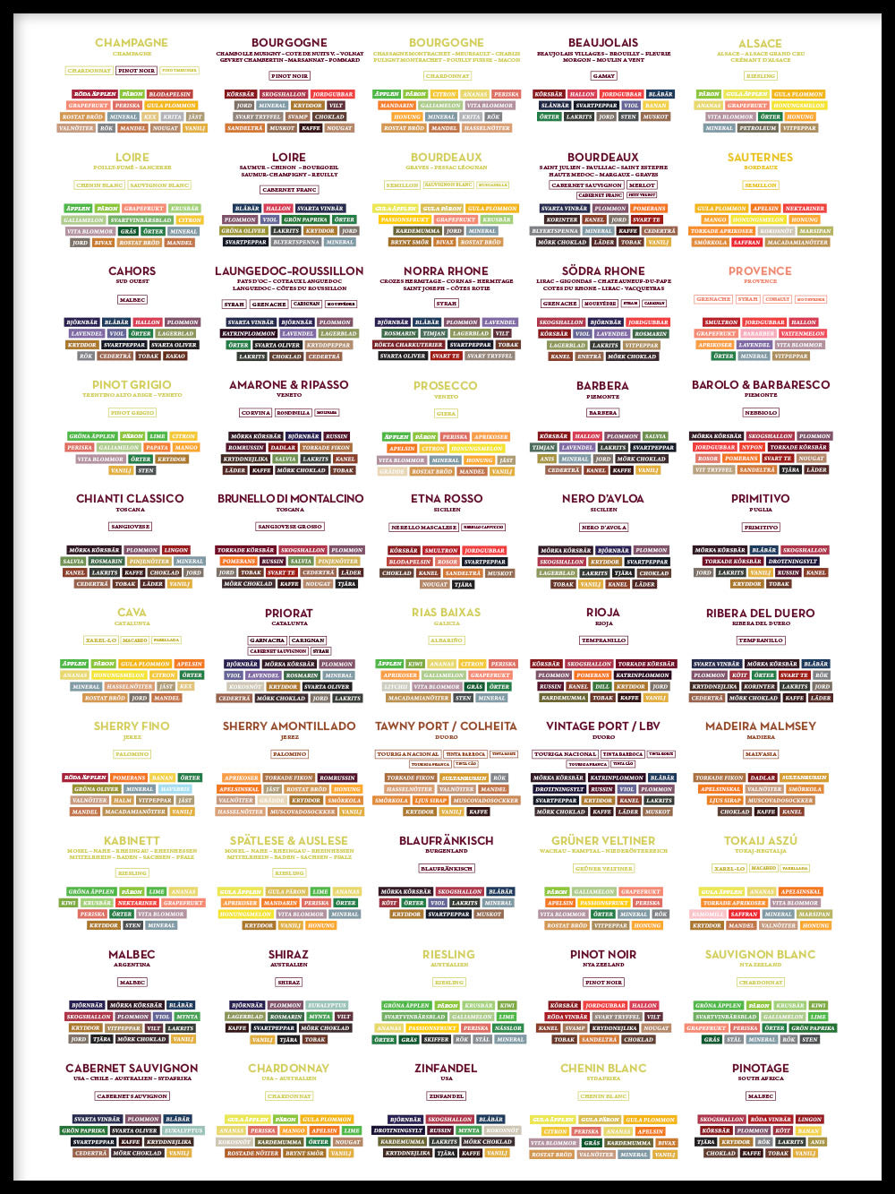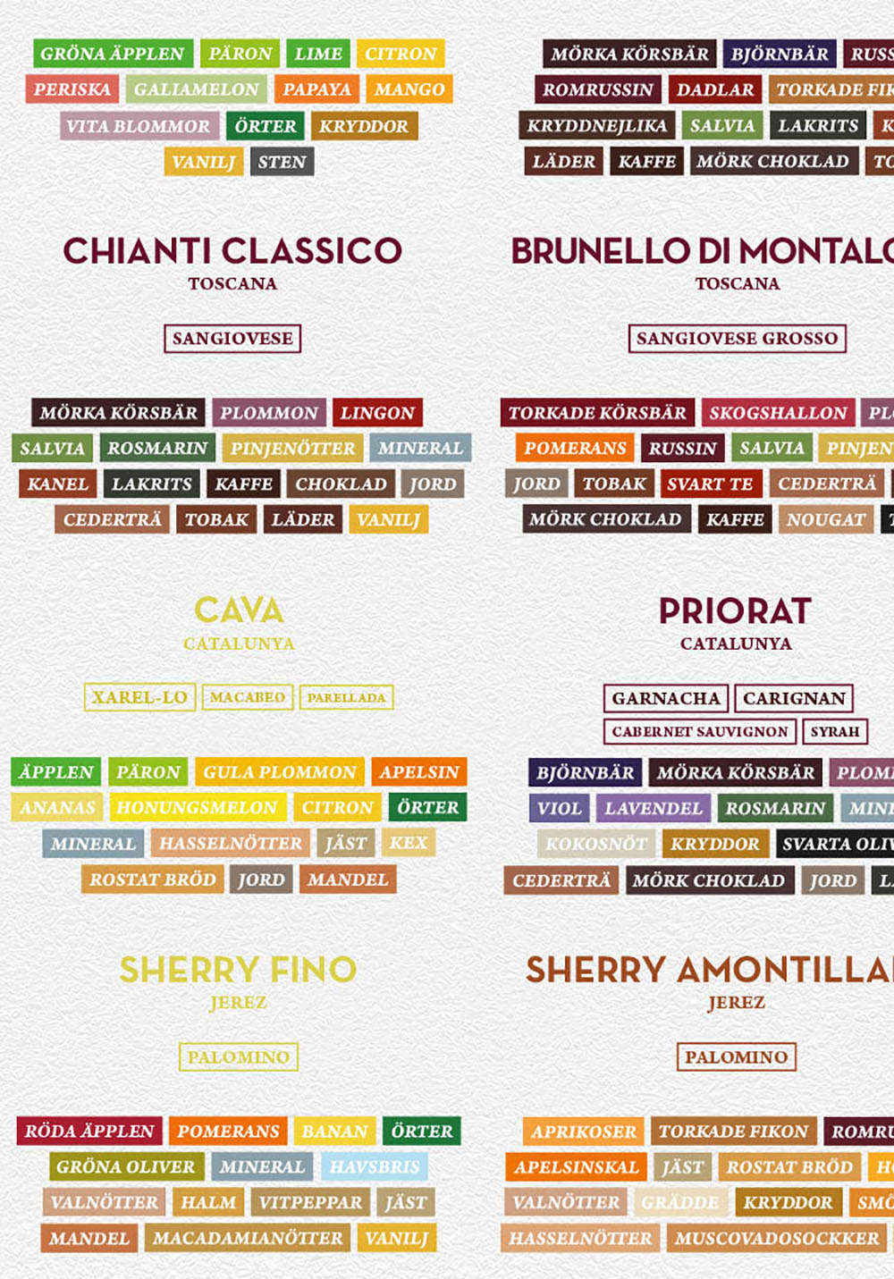 Poster featuring explanations of the flavors of various grape varieties and wine types.