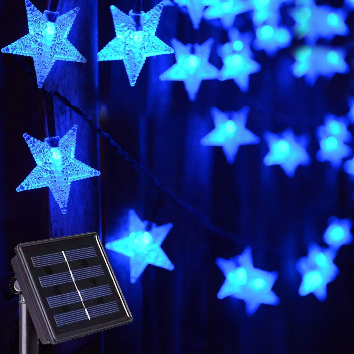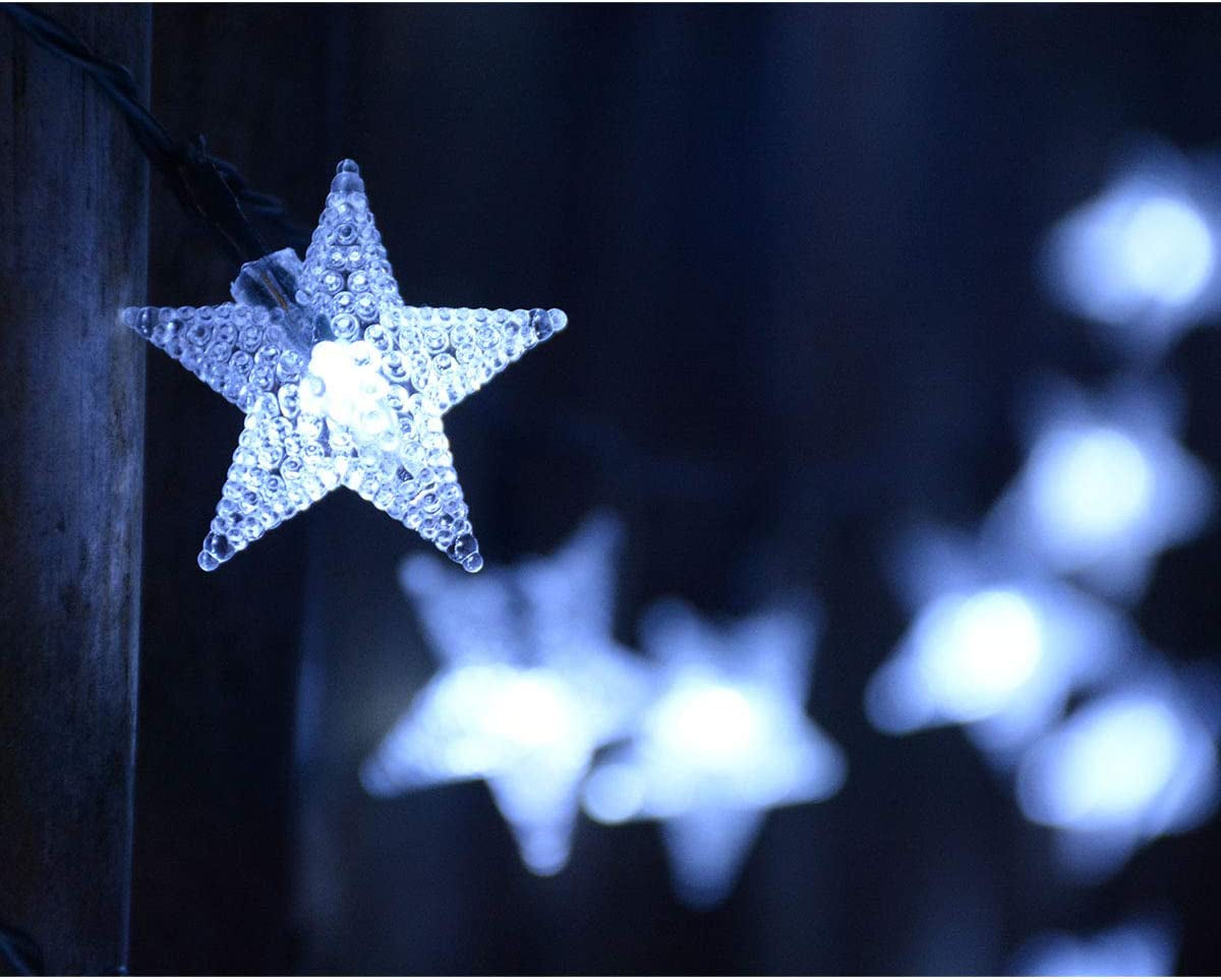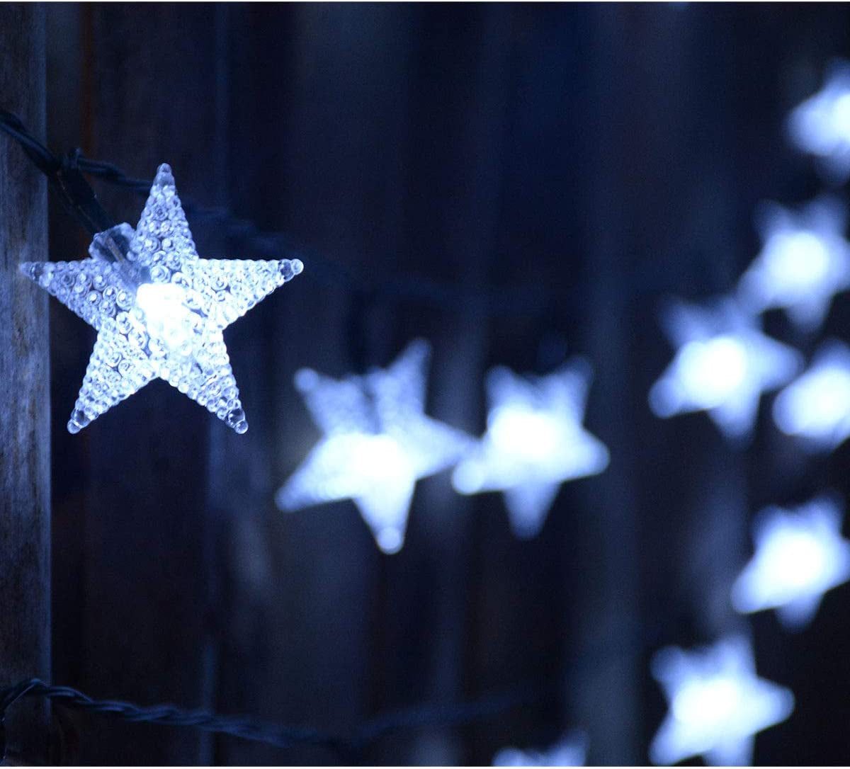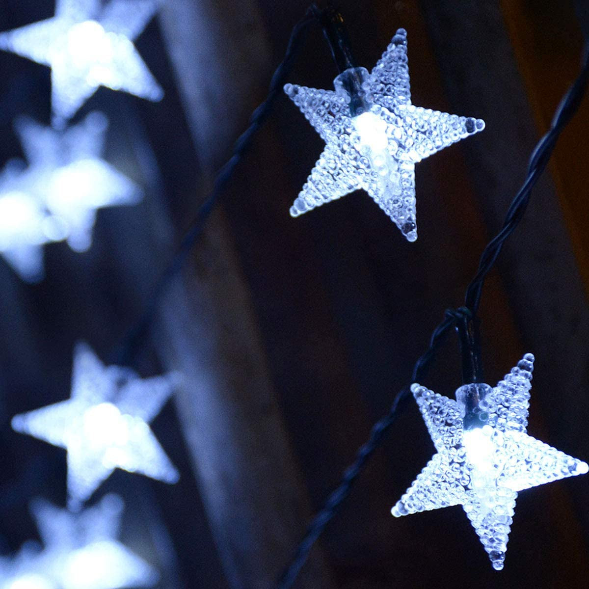 - Outdoor decorative lights: 50 cool white star-shaped LED bulbs on a 30ft pale green wire; 15 cm spacing between the LED bulbs.