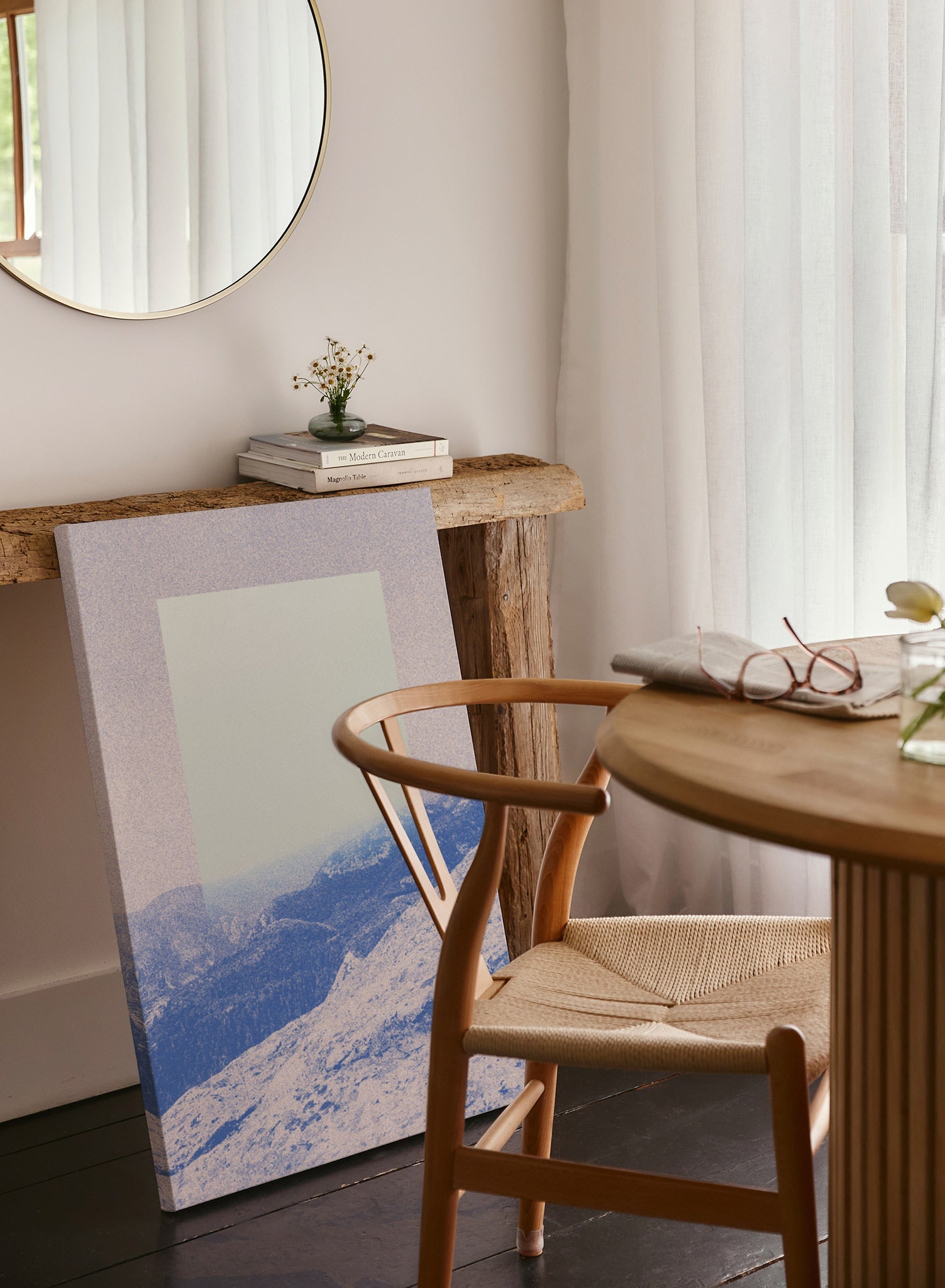 The Something Blue print offers a stunning and imaginative view of snow-capped mountain peaks. This collage highlights the summits with a unique transparent blue square for a striking effect.