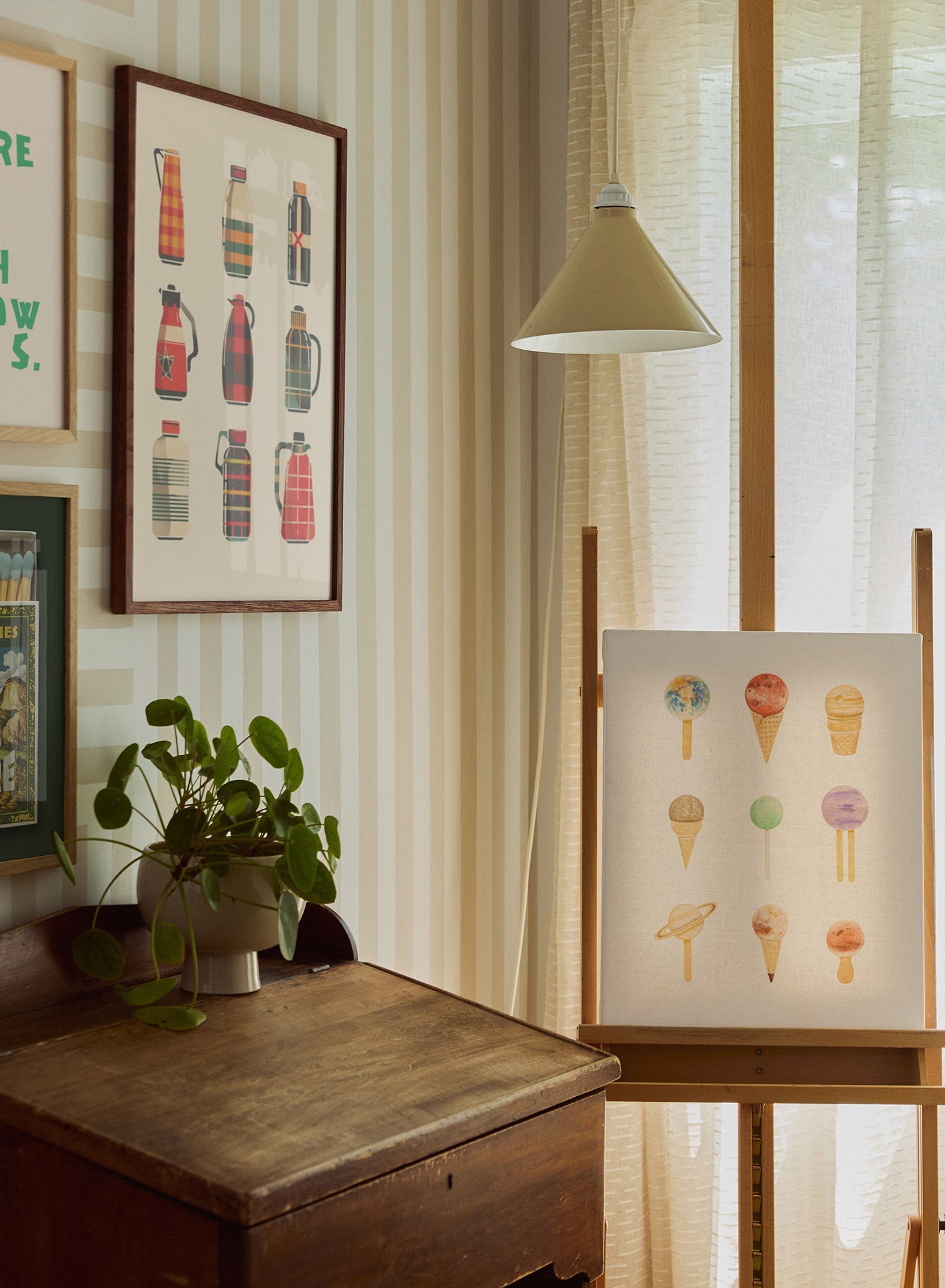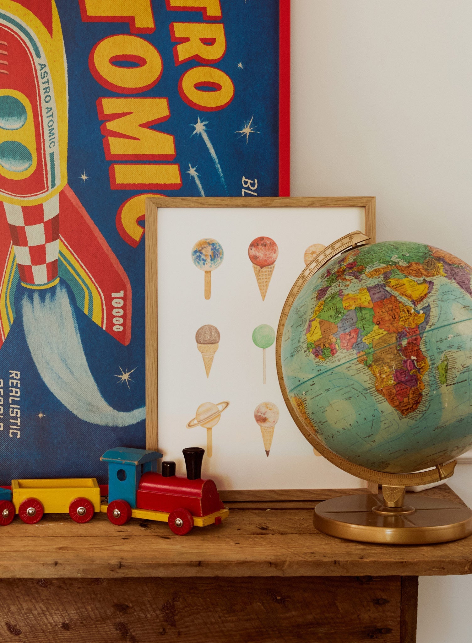 A whimsical print that depicts the planets as different ice cream flavors. The bright colors of the planets and the ice cream (blue, red, green, purple, and brown) wonderfully stand out against a soft cream tone, adding a charming accent to any room.