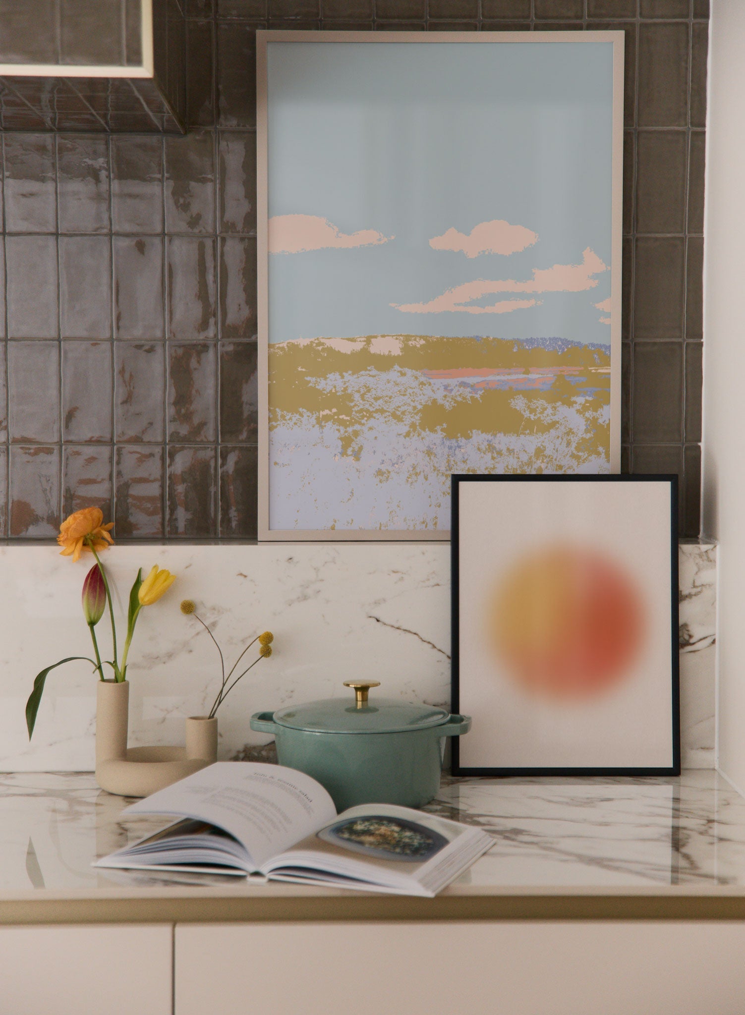 Add a touch of joy to your decor with "Bubbly in Beige": a vibrant, abstract piece featuring a bright, blurred orange sphere set against a beige backdrop.