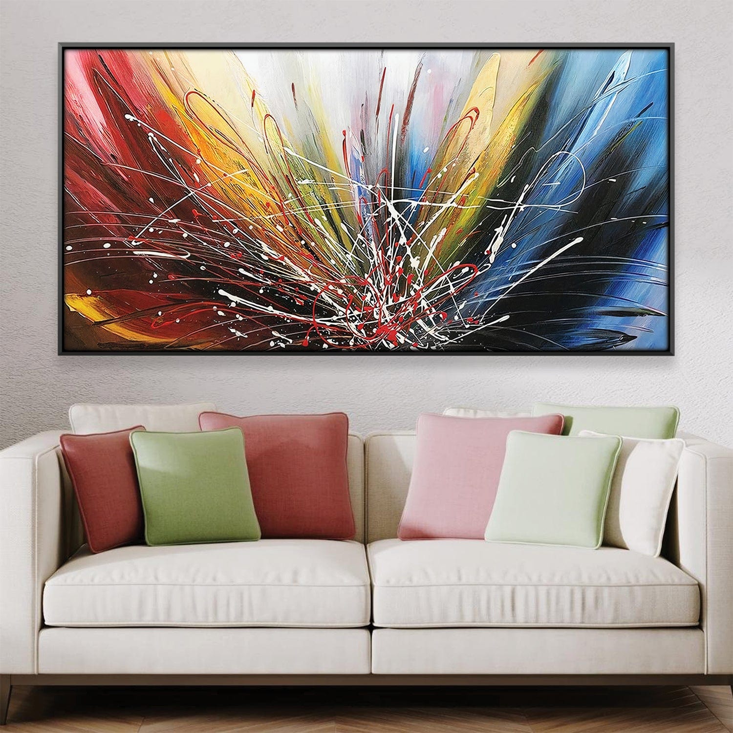 Step into an enchanting realm of color expression with 'Spectrum Splat.' This stunning abstract piece showcases a vibrant splatter painting effect that unleashes a multitude of shades across the canvas. Blending hues of blue, yellow, and red, this artwork radiates a sense of energy and creativity. The title 'Spectrum Splat' perfectly encapsulates the lively burst of emotions and the dynamic nature of this piece. Whether you choose to display it as wall art, canvas art, or framed, 'Spectrum Splat' makes a bold statement that brings an artistic touch to any space.