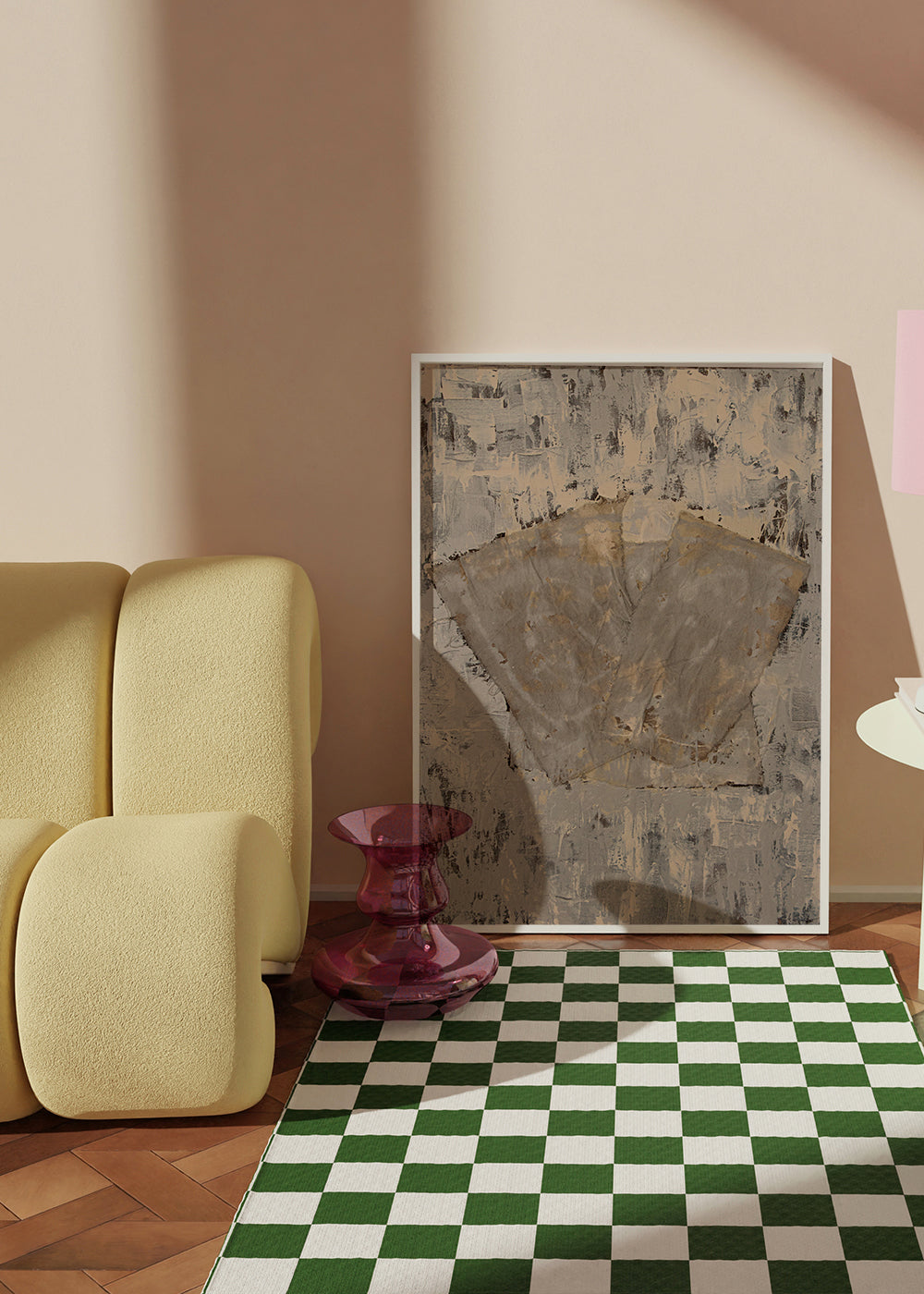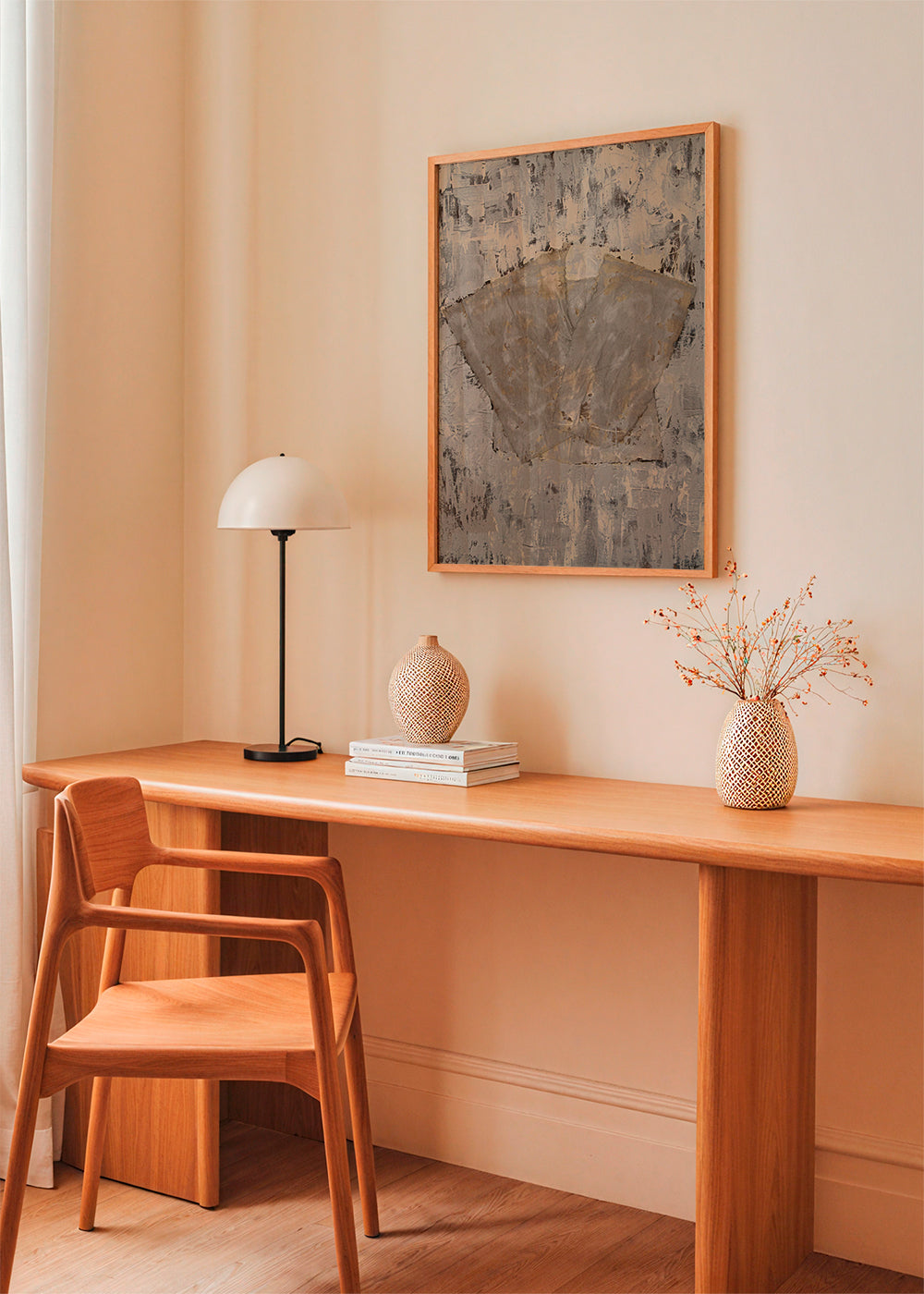 A print from our collection of abstract artworks, designed by Elena Camacho Art, in shades of gray, ideal for vertical display. Abstract Posters are excellent for establishing distinctive and imaginative spaces. Enhance your walls with art.