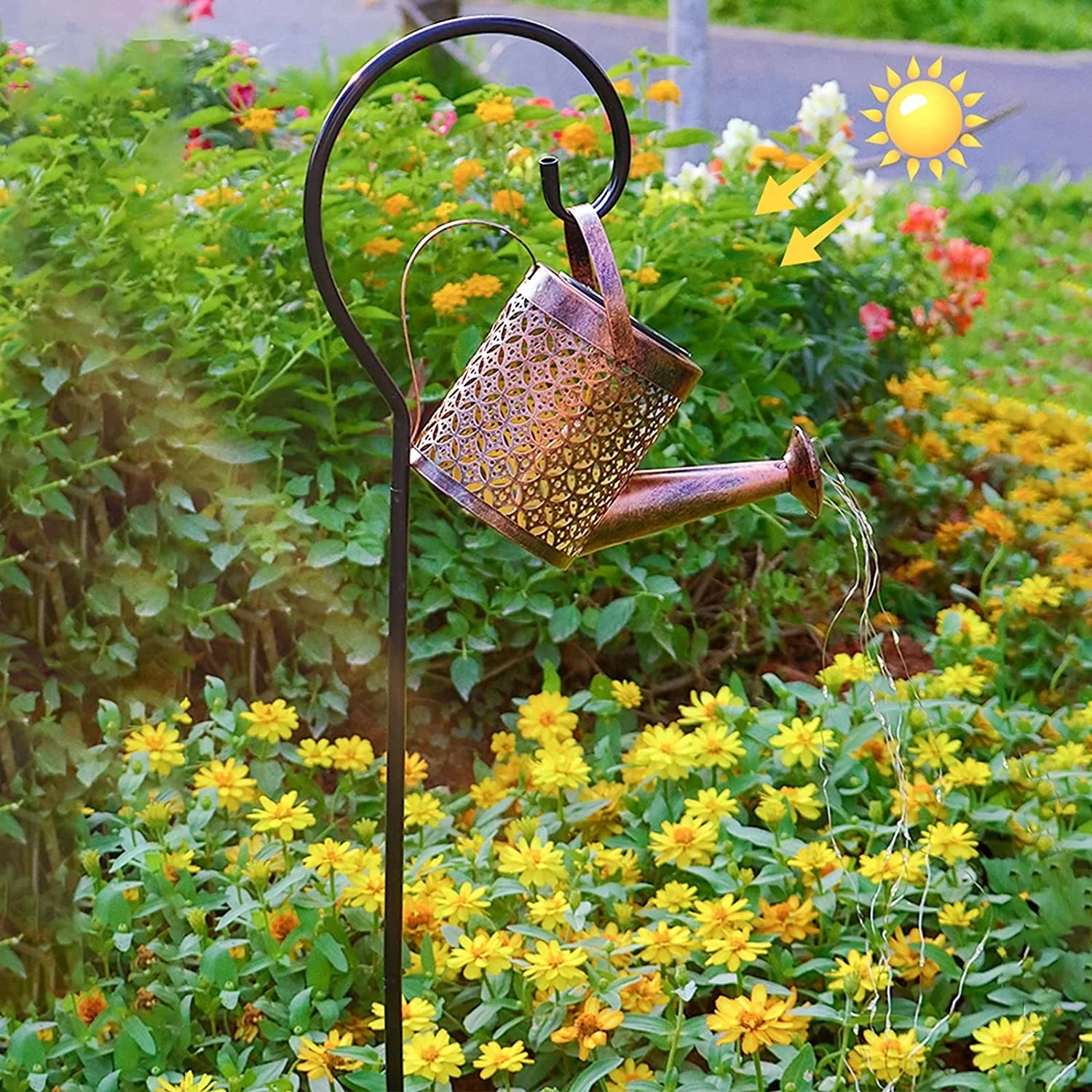 Solvannfall Watering Can with Garden Lighting & Shepherd Hook - The solar panel charges automatically as long as the switch is set to "on." No wires, no worries about electricity bills. It also automatically illuminates after dark. Beautiful patterns dance across the ground and walls, creating a romantic and sophisticated vibe. This watering can features a vintage metal light design with floating twinkling lights, reminiscent of dazzling stars. Whether day or night, it creates a stunning display in your garden.
