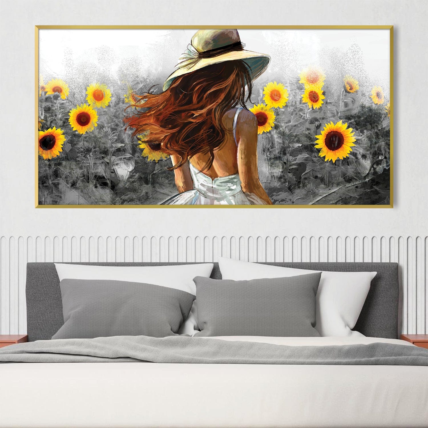 Discover the radiant beauty of "Sunlit Solace," an enchanting wall art piece that portrays a graceful woman surrounded by a field of sunflowers. This artwork, created with meticulous brush strokes and textured effects, brings a sense of tranquility to your space. The harmonious blend of yellow, black, and white hues adds warmth and style to your surroundings. Enhance your interior decor with this delightful piece, which is available as wall art, canvas prints, and framed options.