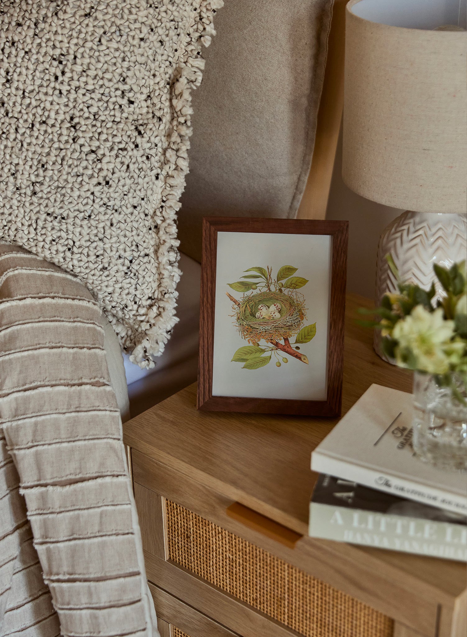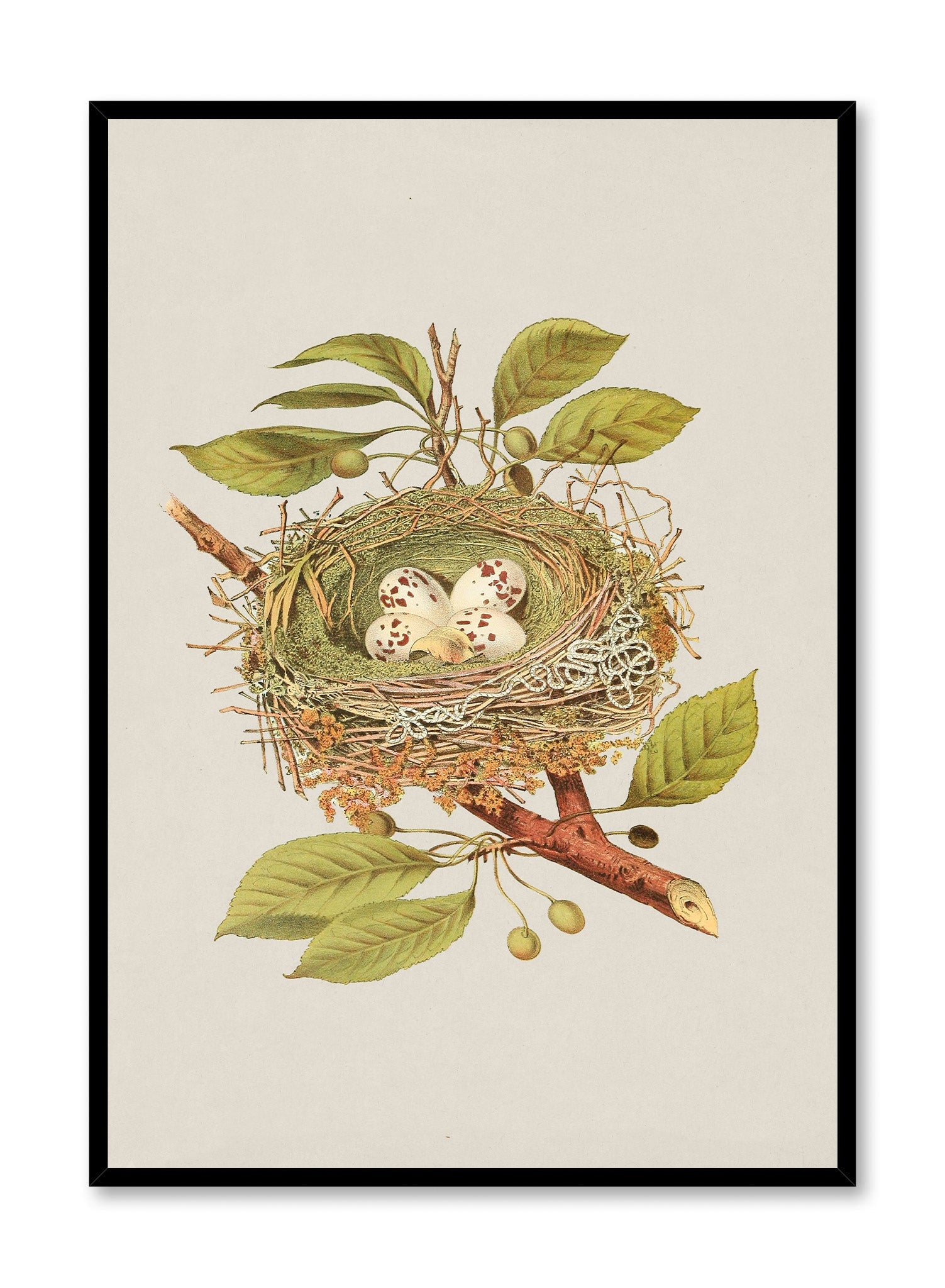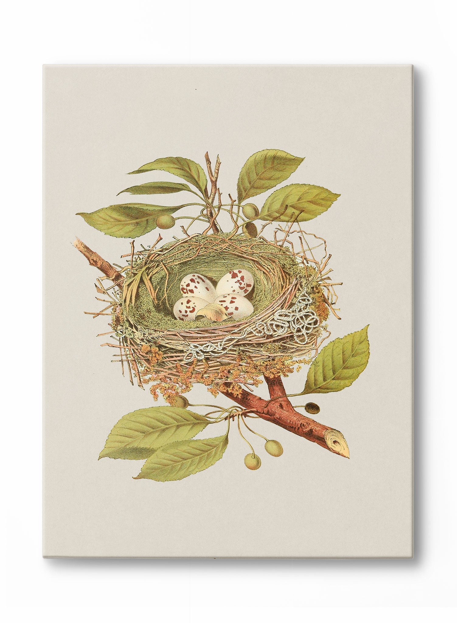 A vintage-inspired botanical nest, meticulously illustrated with speckled eggs, is beautifully captured in this nature-themed print. The intricate details of the leaves, branches, and textures lend the entire composition a lifelike quality, set against a soft, creamy backdrop.