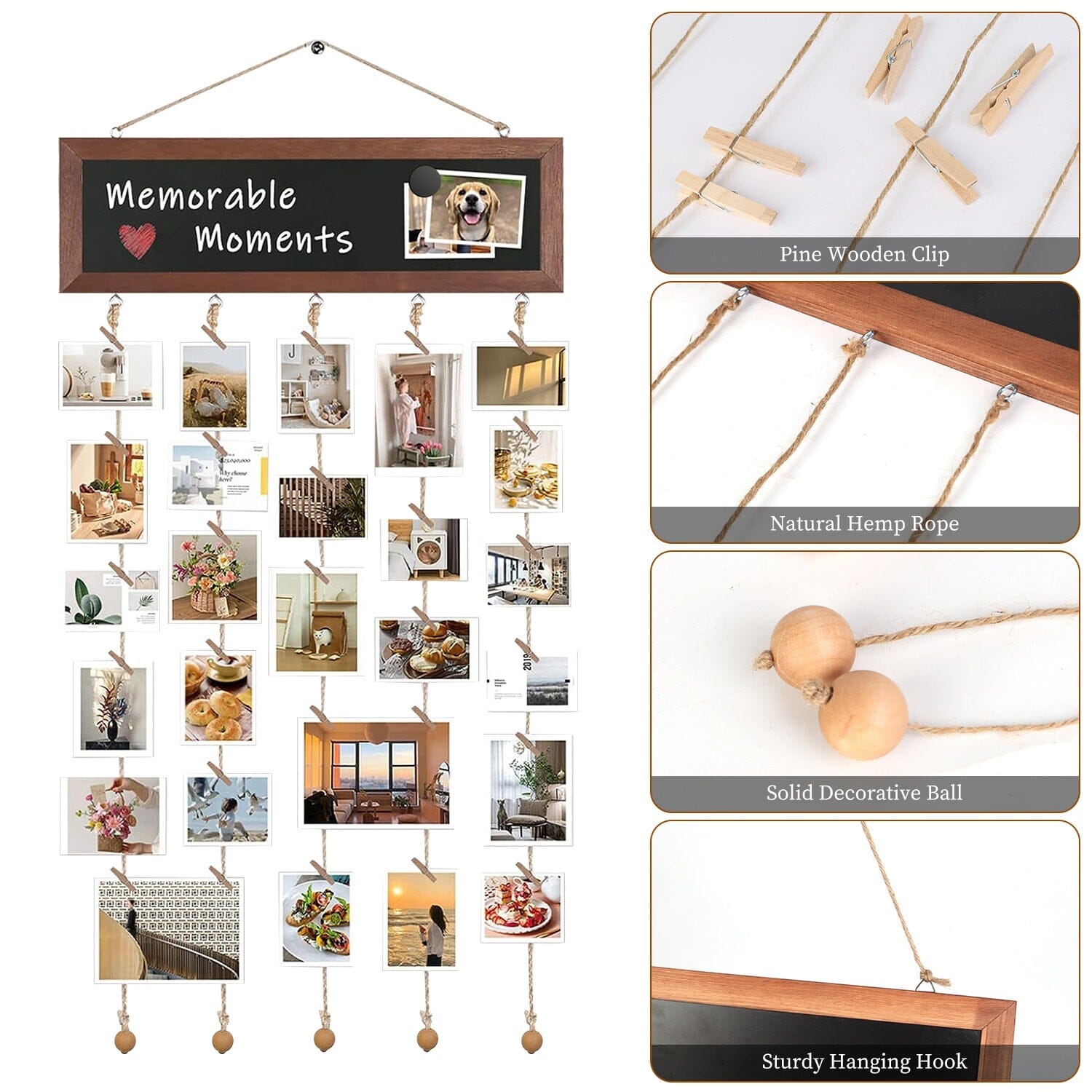 - Easy Installation: Made from natural pine and hemp rope, this picture frame is durable and reusable. The adjustable-length ropes and clothespins are simple to remove, allowing you to customize your personal photo display wall.