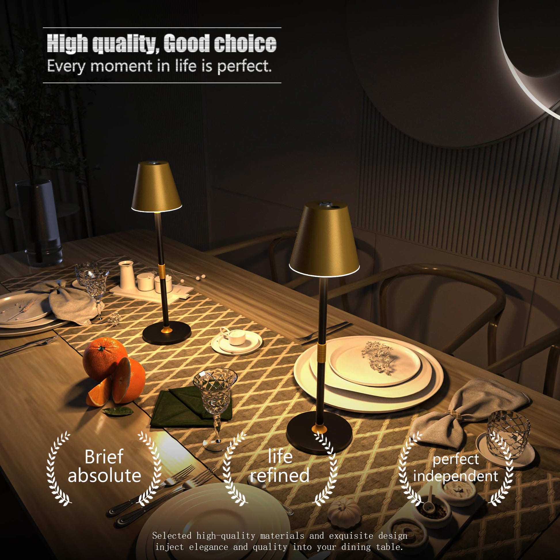 Transform your space with the Timjorman LED Wireless Table Lamp, designed for both versatility and aesthetics. This lamp features a sleek cone shape that integrates effortlessly into any environment, whether it's in bedrooms, bars, or restaurants. With its premium metal construction and a sophisticated finish in Gold & Black, it adds warmth and sophistication to your room.