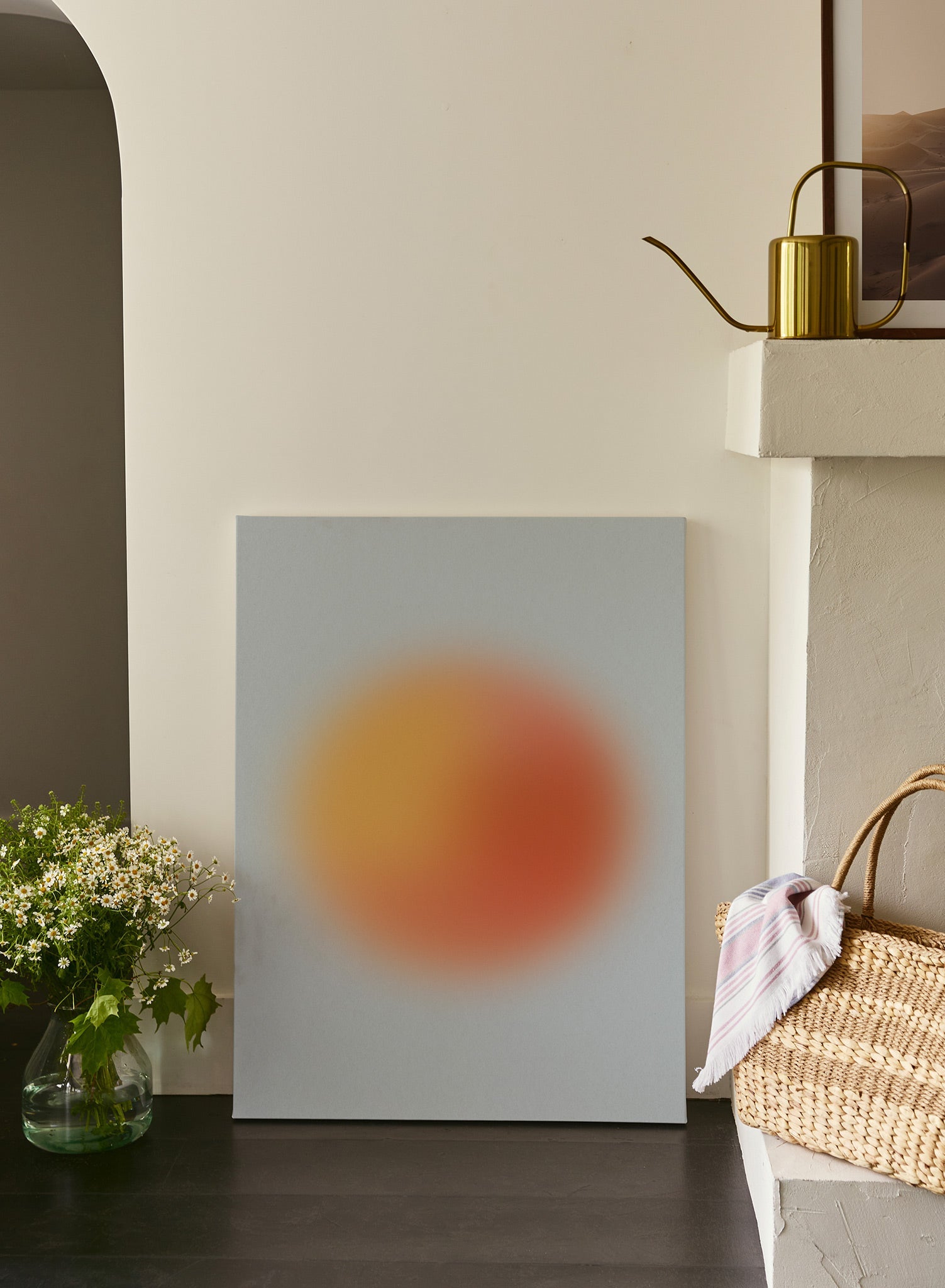 Add a touch of fun to your decor with "Bubbly in Blue": a playful, abstract canvas piece featuring a striking and blurred orange sphere set against a sky-blue backdrop.