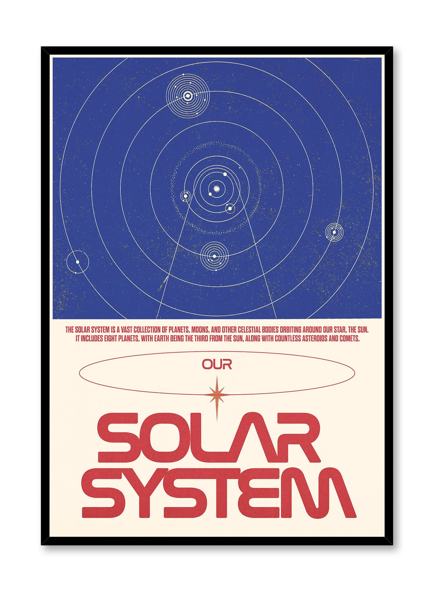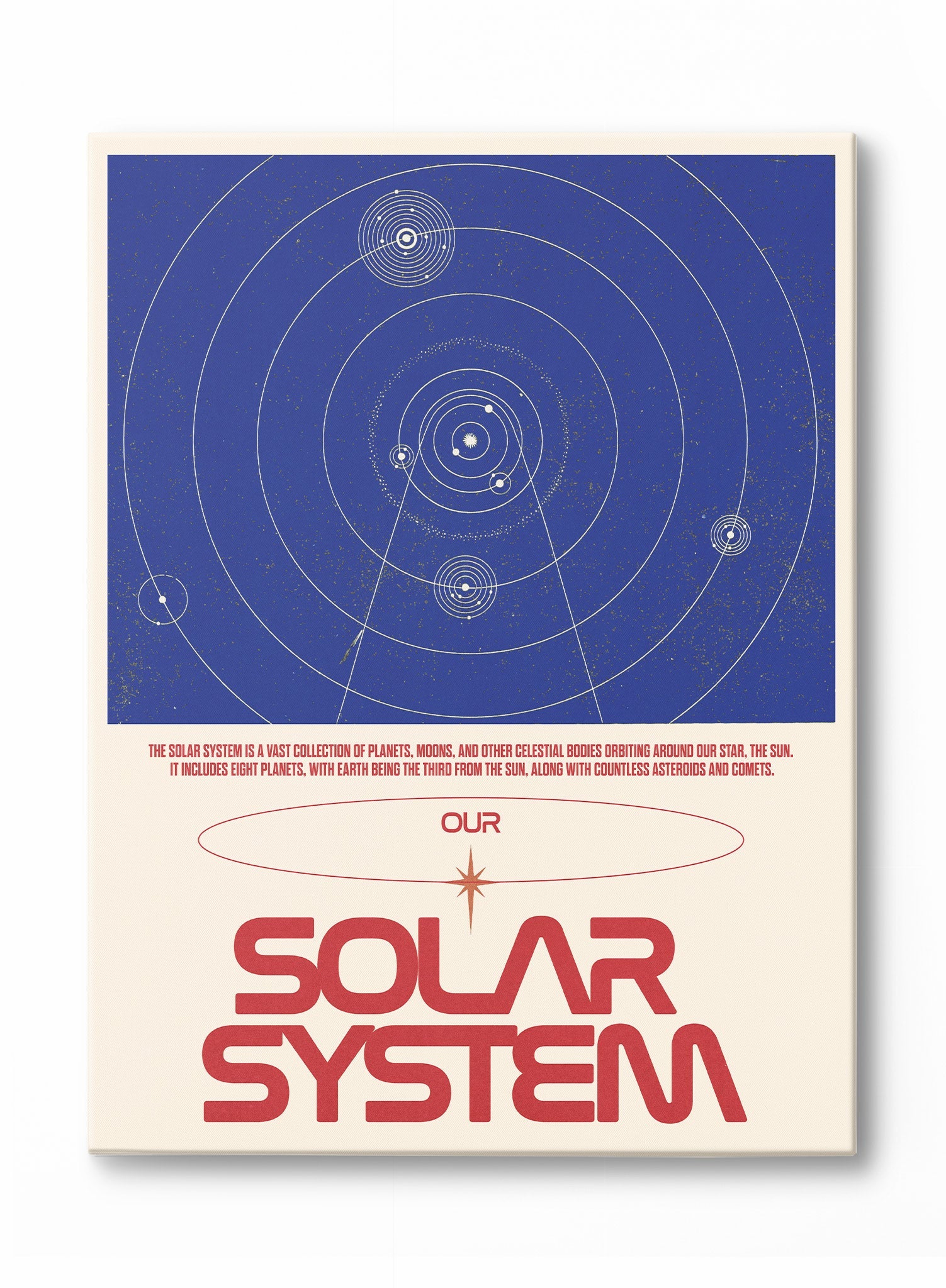 This educational art print offers an accurate representation of our solar system, showcasing planets, moons, and other celestial bodies orbiting the sun. The vibrant blue and red hues of the design are both informative and visually pleasing, making it an excellent addition to any space-themed room.