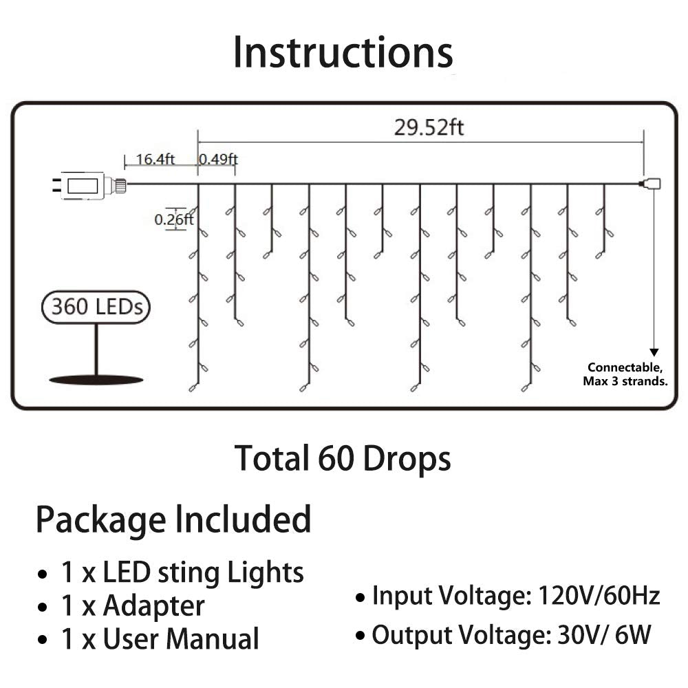 - **Impressive Specifications**: The light strand features 360 bright LED bulbs distributed over 60 drops, with an overall length of 9 meters and a 5-meter lead. They can be connected together, allowing you to link up to 3 strands for larger displays.