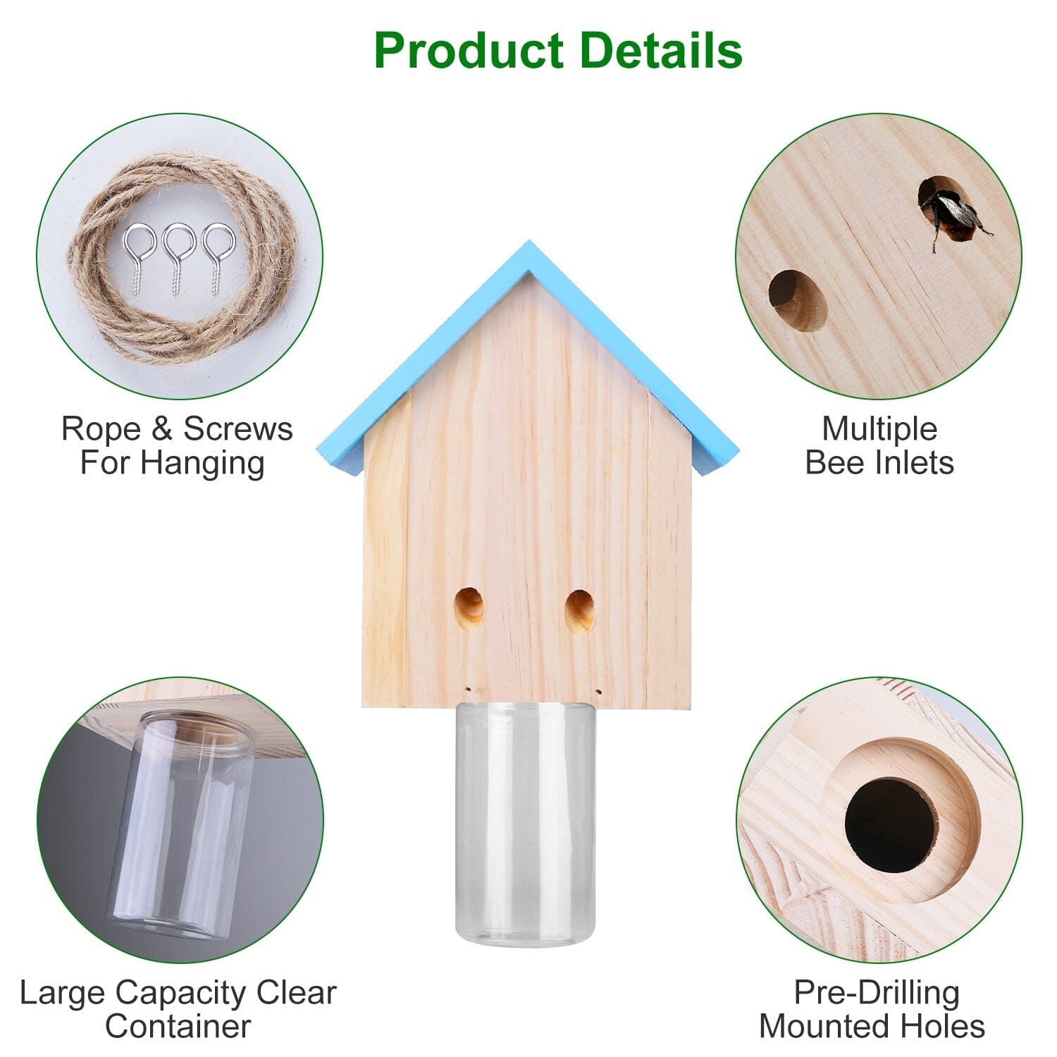 - Natural Pine Material: Made from natural pine, this wooden bee trap is designed to attract bees by mimicking their ideal nesting structure, ensuring high performance and durability. Choose our harmless carpenter bee trap to foster a clean and healthy environment for your family and pets!