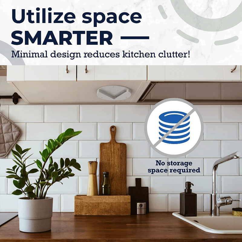 - Under Cabinet Installation: Efficiently saves counter space and is always within reach. We use double-sided tape for a seamless attachment to the cabinet and provide screws for added reinforcement.