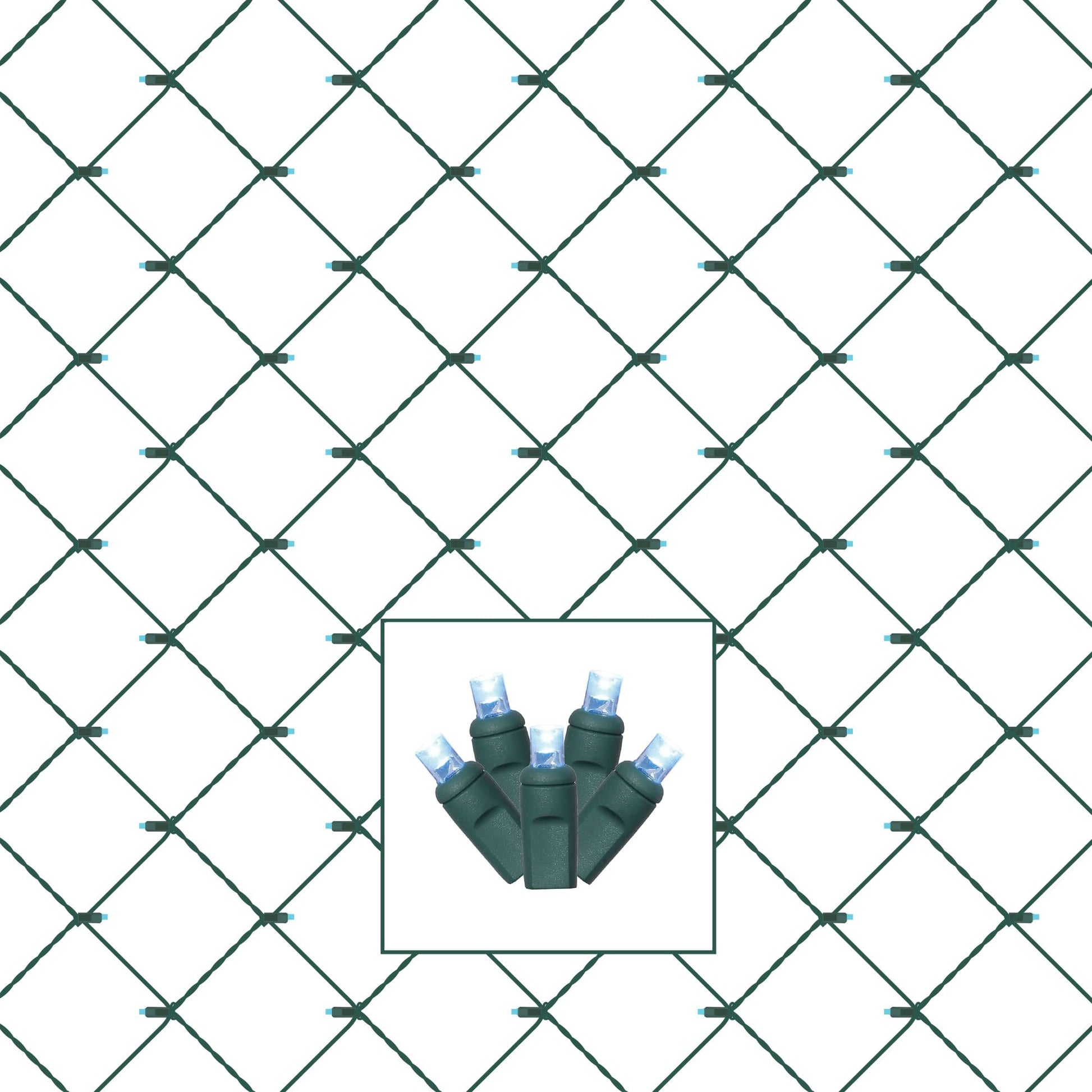 Light up your festive season with the Vickerman 120 Turquoise Wide Angle LED Christmas Net Twinkle Lights Set. This net light display features 120 turquoise twinkling LED bulbs with a wide angle, securely attached to green wiring, measuring 30 cm in length and 10 cm apart. This net light set measures 1.2 m in height and 1.8 m in width, is UL certified, and can be connected to up to 17 additional sets. It operates at a power of 9.6 watts.