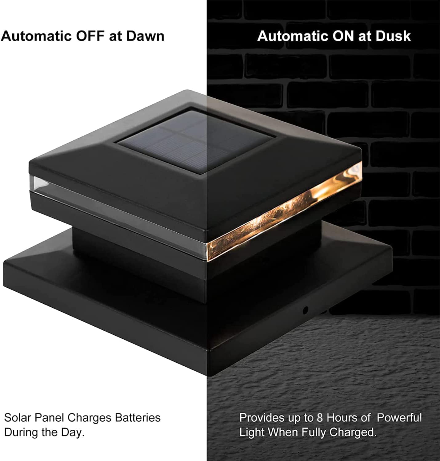 - **Efficient solar energy**: Each post light features a monocrystalline solar panel and a 1.2V 1000mAh rechargeable NI-MH battery, providing up to 8 hours of lighting after a full day of sunny charging (6-8 hours). Enjoy maintenance-free reliability for many years to come.