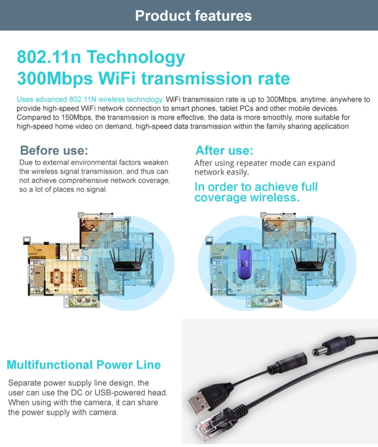 2. Supports Wi-Fi transmission protocols 802.11b/g/n with a transmission rate of 300Mbps.