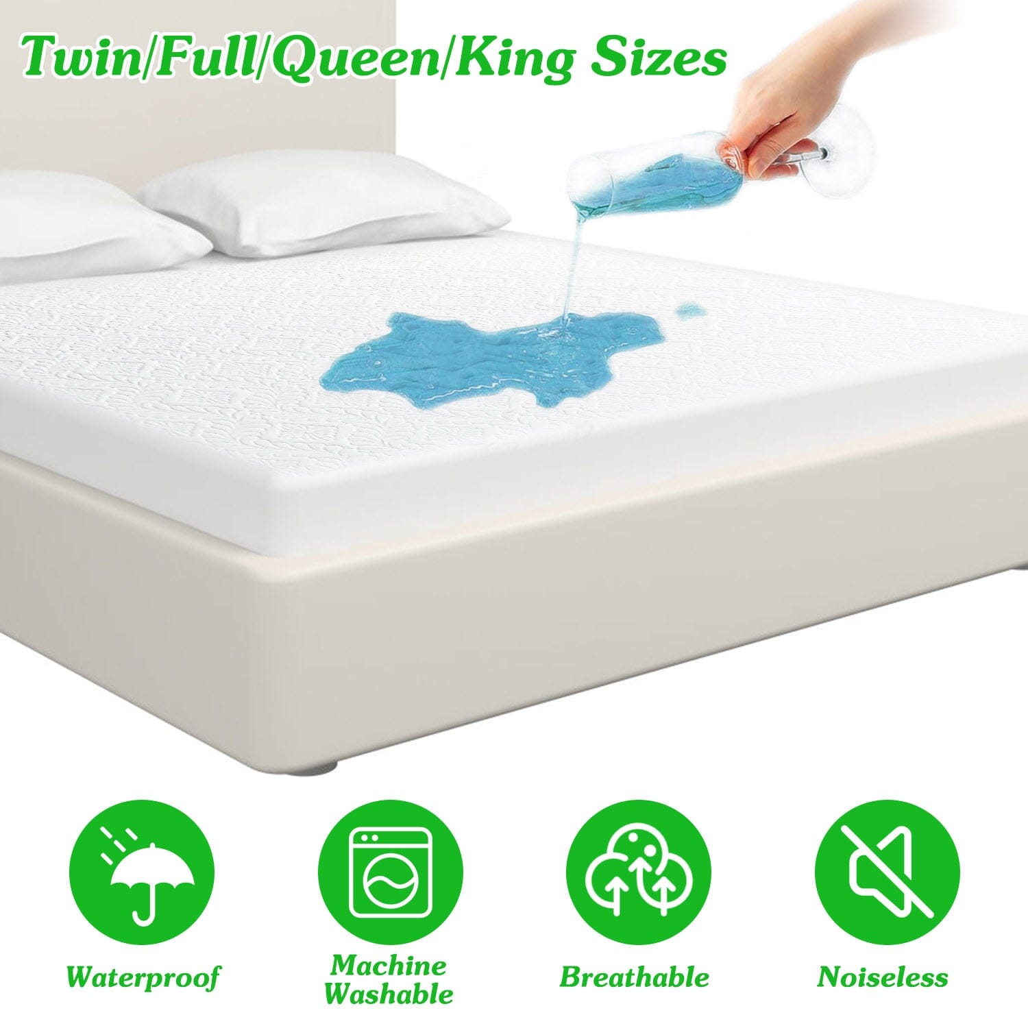 - Mattress protector in 4 standard sizes: Our standard size mattress protector comes in 4 distinct sizes (twin, full, queen, and king), enveloping each corner of your treasured mattress securely. It's the perfect addition to any bedroom, giving you peace of mind that your mattress is well protected, so you can enjoy a restful night’s sleep.