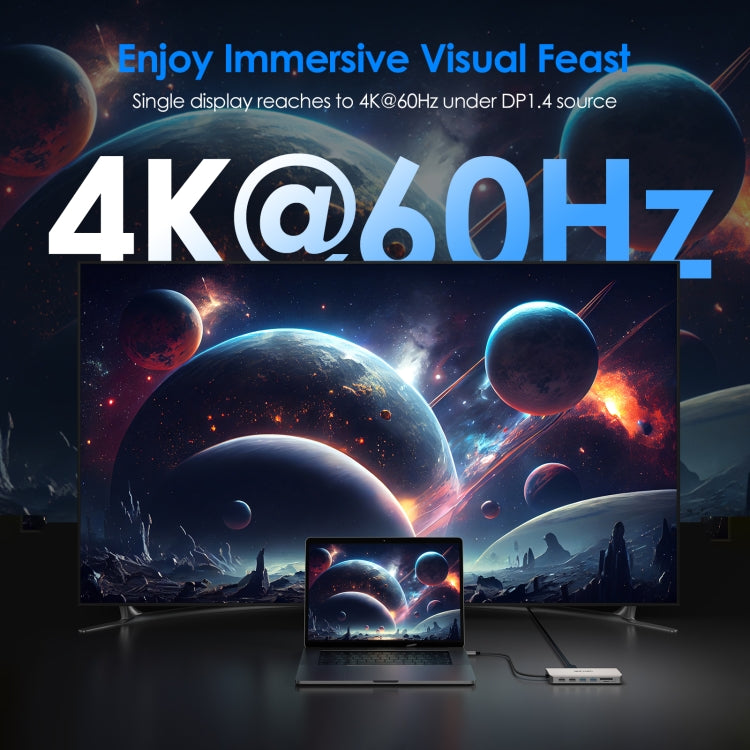 2. Ports: 1x USB-C (PD IN, 100W), 1x HDMI (4K 60Hz), 2x DisplayPort (4K 60Hz), 1x Gigabit RJ45, 2x USB-A 3.0 (5Gbps), 2x USB-A 2.0 (480Mbps), 1x SD card slot, 1x TF card slot, 1x audio/microphone jack