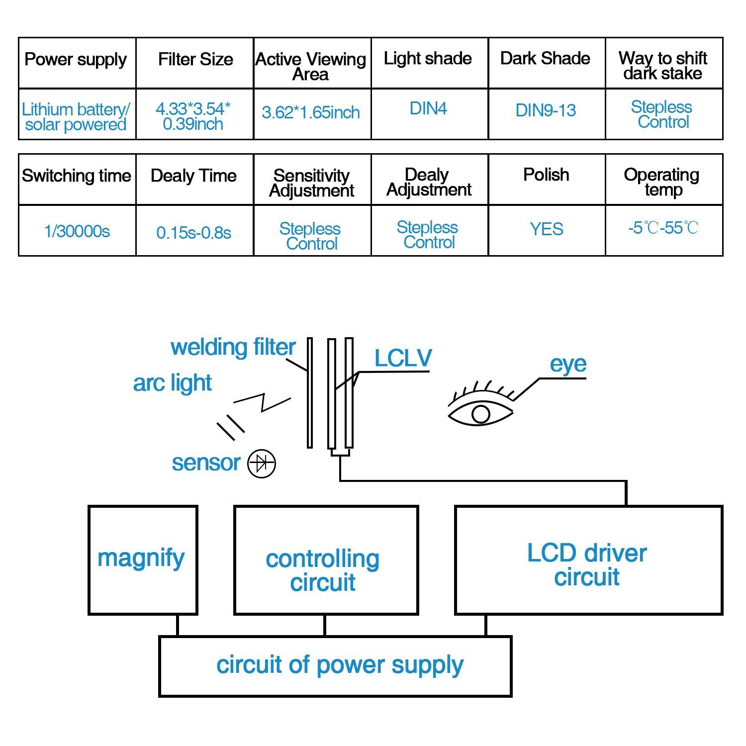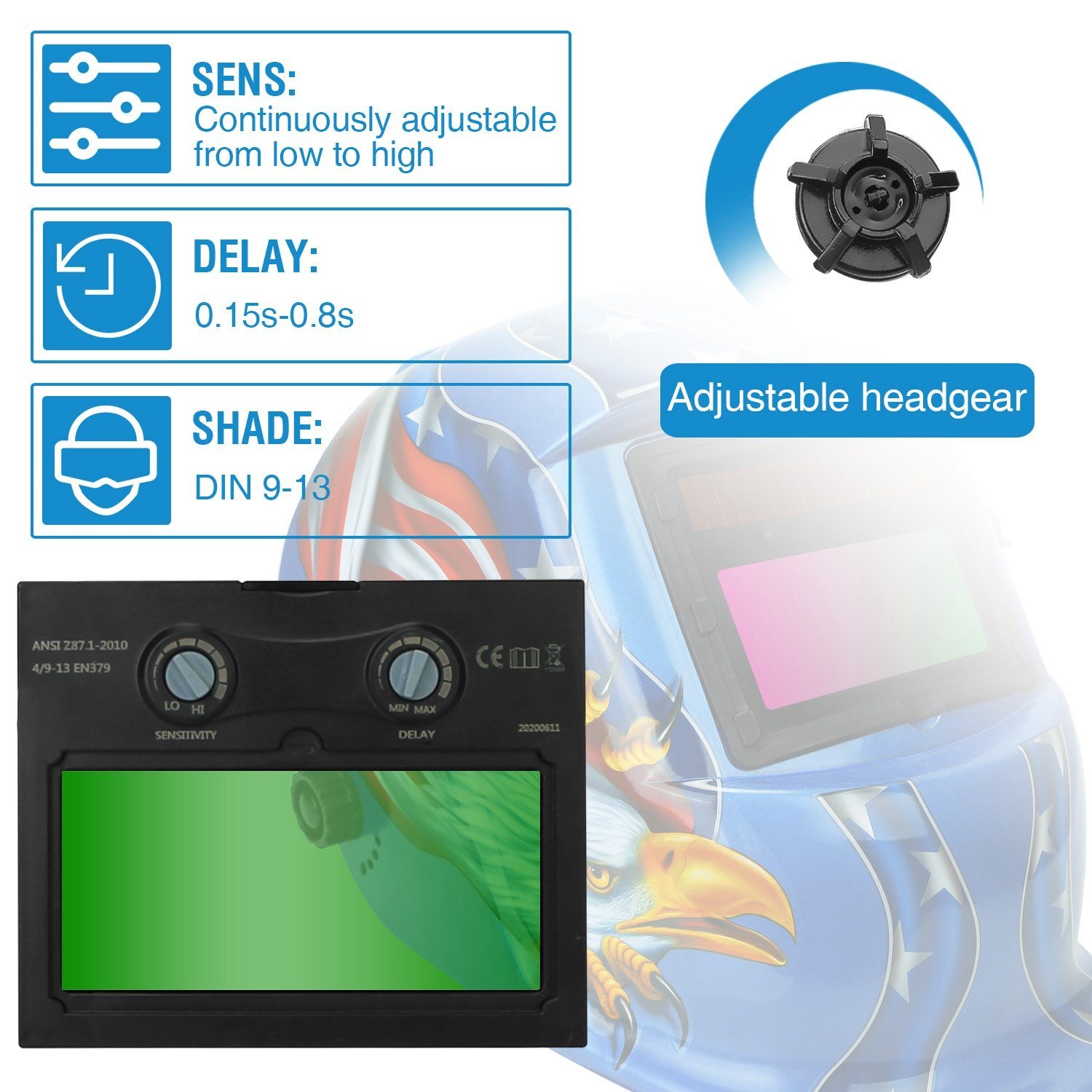 - Equipped with sensitivity and delay settings for customization to varying environments and task durations. Experience enhanced visibility and improved color recognition. The filter's light level is DIN4, and the transition time from dark to light is between 0.15s and 0.8s.