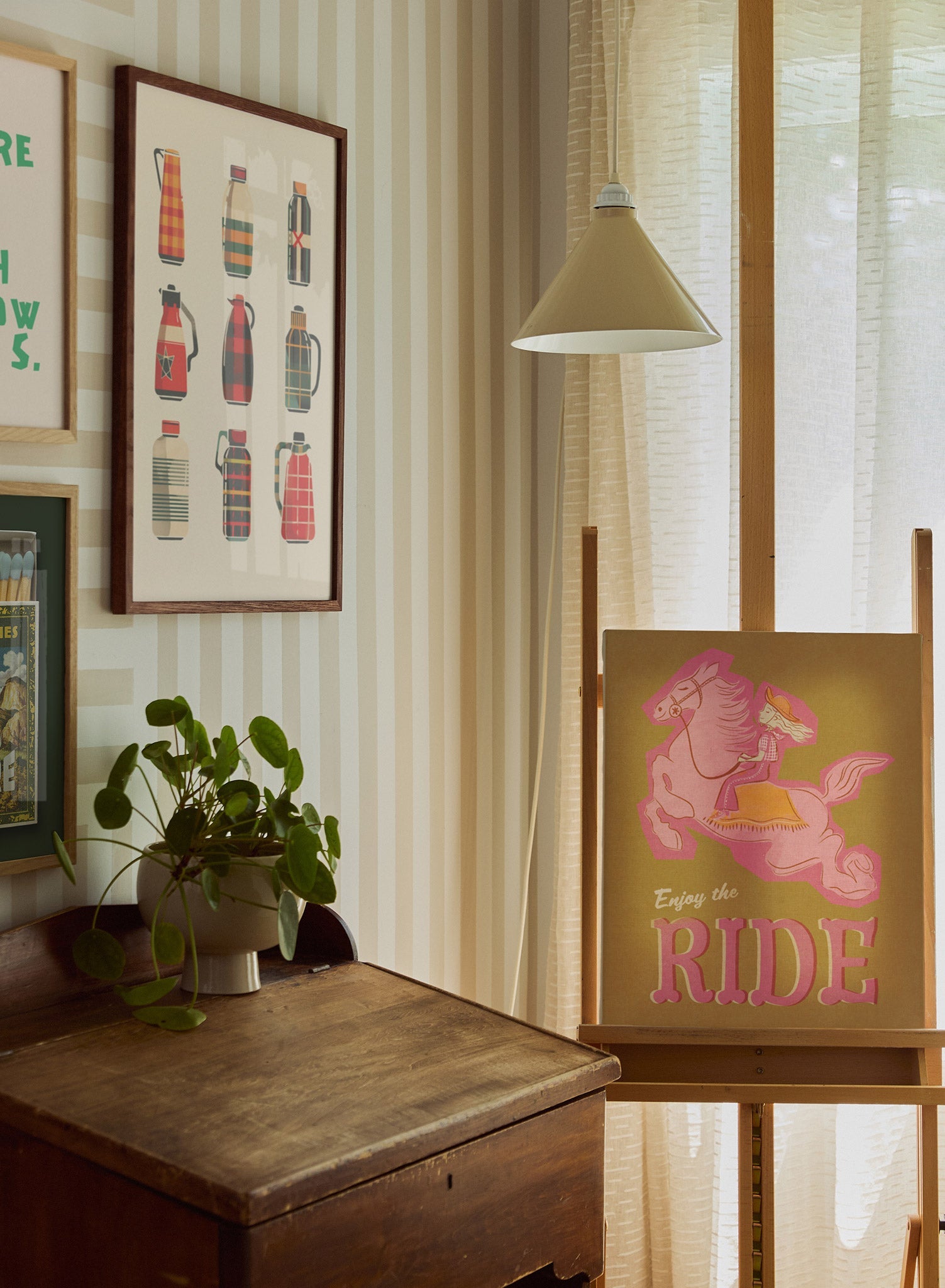 A fascinating piece of art that depicts a little girl riding a vibrant pink horse against a warm brown background. The phrase 'Enjoy the Ride' is presented in a playful, bold font in pink and white, adding a cheerful touch to the image. The bright pinks and natural browns create a happy and lively atmosphere, making it perfect for a child's room or play area.