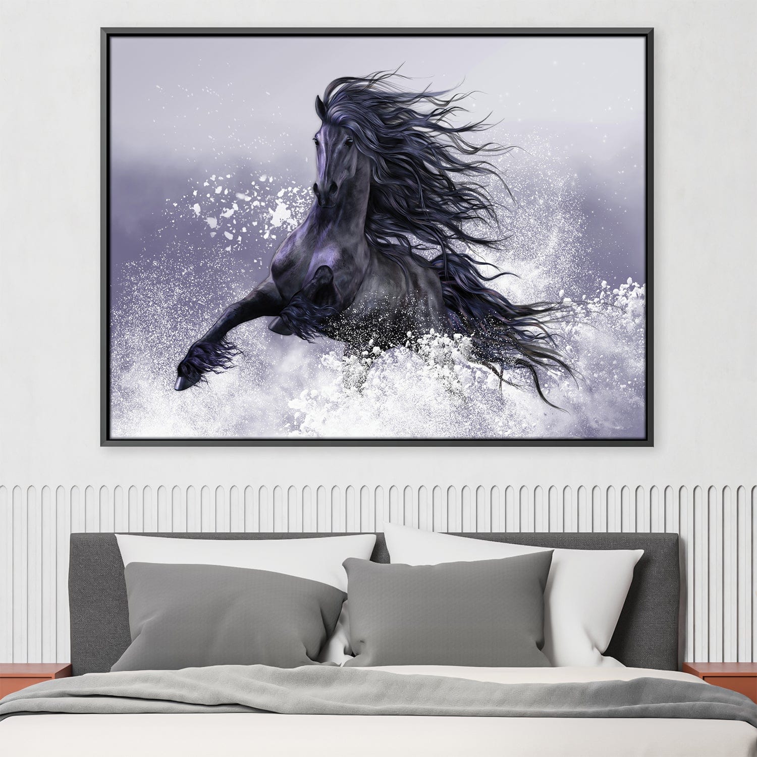 Add a touch of sophisticated elegance to any standalone wall in your home with this stunning art print. This canvas features a depiction of a black horse leaping through water.�����Artist:�����Laurie Prindle