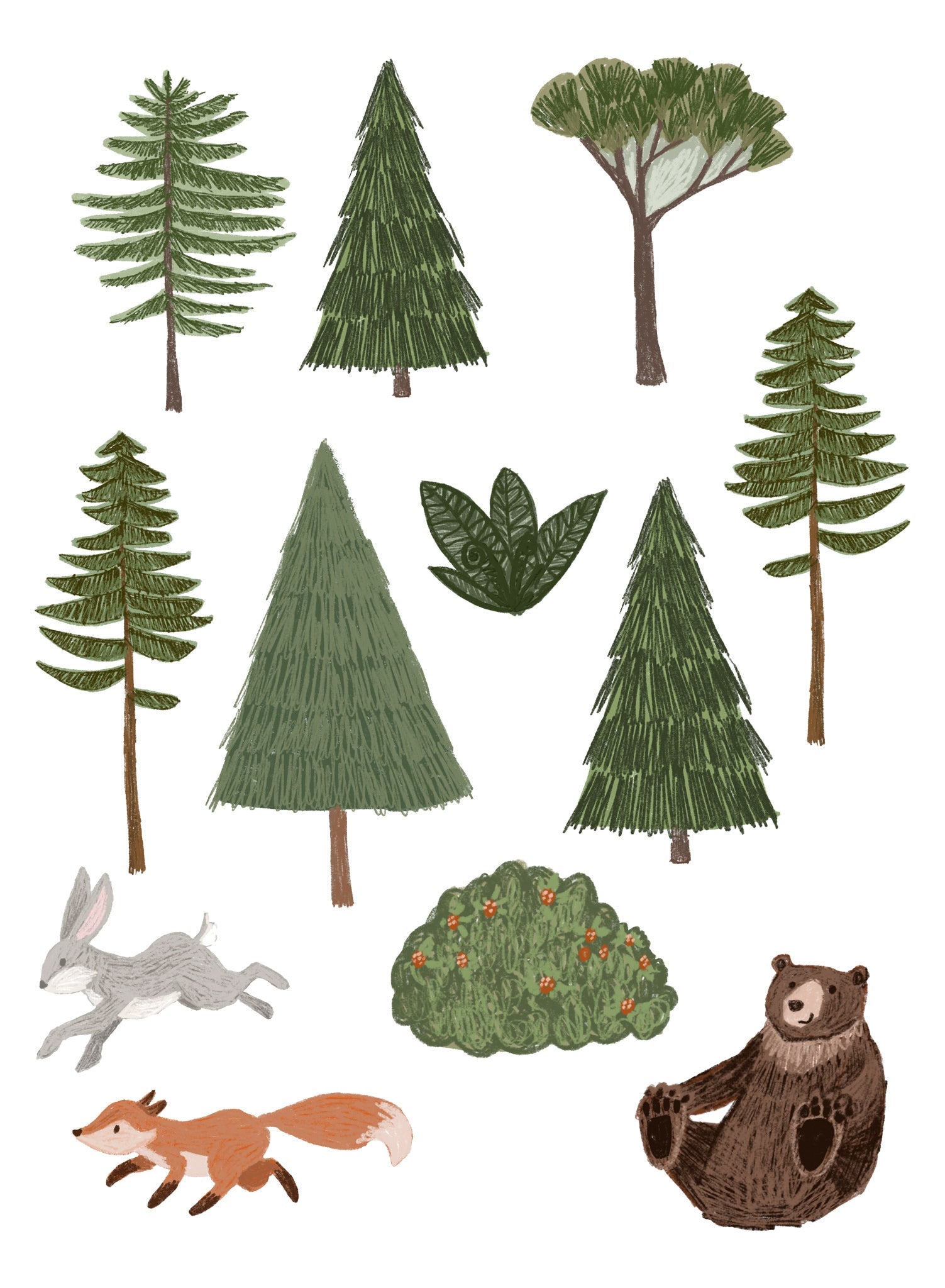 Transform your child's room or play area into an enchanting forest adventure with these removable wall stickers that feature a variety of trees, bushes, as well as a bear, a fox, and a rabbit. These forest vinyl wall decals are easy to apply, won't damage your walls, and can be arranged in countless ways!