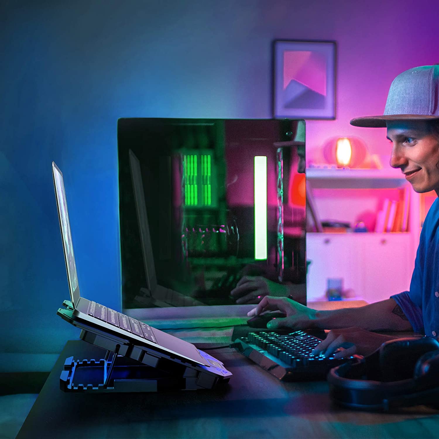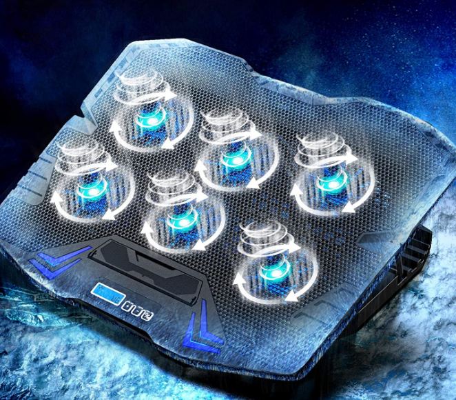 -Equipped with a metal mesh surface, this gaming laptop cooling pad includes 6 turbo fans that provide airflow and generate powerful wind to dissipate the laptop's heat.